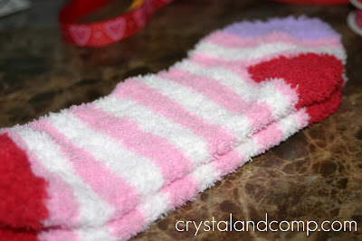 This is a super simple Valentine’s Day gift that would be perfect for a teacher or loved one this year. This project is certainly flexible and could be customized for any holiday. This would also rock as a party favor for an older girls birthday party- you can easily find the socks in childrens’ sizes.