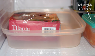 All of these questions help me determine if a crockpot meal, a casserole, a one-pot-stove-top-dinner, etc. is going to be best for tomorrow night. I look over my meal options for the week and determine which one we will have for dinner tomorrow night and place it in the fridge in a container so it can start defrosting.